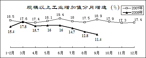 前三季度,规模以上工业增加值同比增长15.2%,增速同比减缓3.3个百分点。其中,7、8、9月增速分别为14.7%、12.8%和11.4%,减速趋势十分明显,9月份增速为2002年4月以来月度最低水平。前8个月,工业企业实现利润18685亿元,增加3035亿元,增长19.4%,增幅同比回落17.6个百分点。