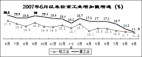 重工业生产增速回落较大。前三季度,轻、重工业增加值同比分别增长13.1%和16%,增速同比减缓3和3.6个百分点。轻重工业增速差距由去年同期的3.5个百分点缩小到2.9个百分点(2007年全年为3.3个百分点)。