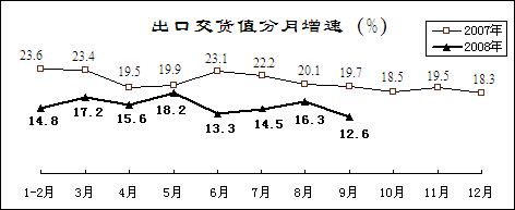 工业产品出口增幅回落。前三季度,工业出口交货值60492亿元,同比增长15.7%,增速同比减缓6.1个百分点。其中,9月份增长12.6%,增幅为2002年以来月度最低水平。