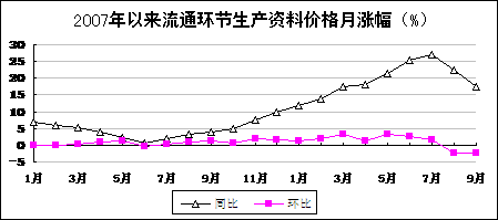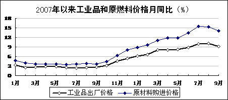 生产资料价格涨幅高位回落。9月份,流通环节生产资料价格比上月下降2.4%,已连续2个月环比下降;同比上涨17.5%,涨幅比上月回落5个百分点。工业品出厂价格同比上涨9.1%,比上月回落1个百分点;原材料、燃料、动力价格上涨14%。