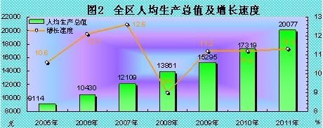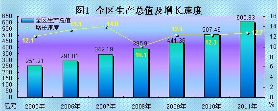 初步核算,2011年,实现全区生产总值(GDP)605.83亿元,按可比价格计算,比上年增长12.7%。其中:第一产业增加值74.35亿元,增长3.4%;第二产业增加值209.54亿元,增长18.3%;第三产业增加值321.94亿元,增长11.6%。人均地区生产总值20077元,增长11.3%。