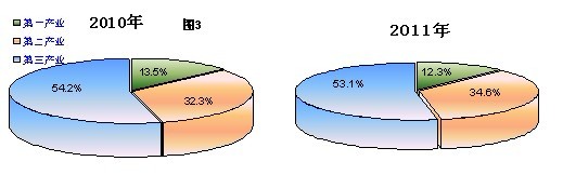 在全区生产总值中,第一、二、三产业增加值所占比重分别为12.3%、34.6%、53.1%,与上年相比,第一产业比重下降1.2个百分点,第二产业提高2.3个百分点,第三产业下降1.1个百分点。