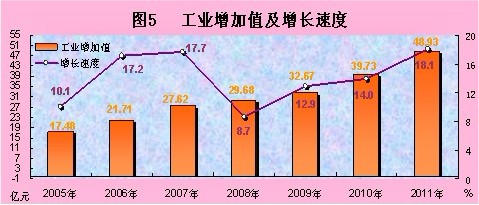 全年全部工业实现增加值48.93亿元,比上年增长18.1%。规模以上工业企业实现增加值37.15亿元,比上年增长19.0%。其中:年主营业务收入2000万元以上工业企业实现增加值35.38亿元,比上年增长20.1%。其中:轻工业实现增加值11.74亿元,增长16.2%;重工业实现增加值25.41亿元,增长20.4%。国有及国有控股企业全年实现增加值20.16亿元,比上年增长21.3%。按登记注册类型分,国有企业实现增加值13.45亿元,增长31.1%;集体企业实现增加值0.84亿元,增长21.9%;股份制企业实现增加值18.35亿元,增长11.4%;股份合作企业实现增加值0.07亿元,增长77.3%;外商及港澳台企业实现增加值2.15亿元,增长2.6%;其他经济类型企业实现增加值2.29亿元,增长48.5%。
