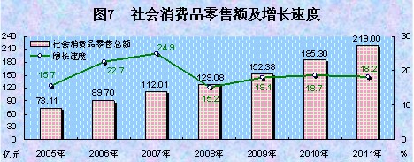 全年实现社会消费品零售总额219亿元,比上年增长18.2%。分地域看,城镇消费品零售额179亿元,增长19.1%;乡村消费品零售额40亿元,增长14.3%。分行业看,批发和零售业零售额184.27亿元,增长17.0%;住宿和餐饮业零售额34.73亿元,增长25.0%。