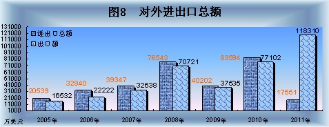全年进出口总额135861万美元,比上年增长62.5%。其中:出口总额118310万美元,增长53.4%;进口总额17551万美元,增长1.7倍。