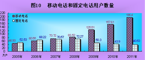 全年完成邮电业务总量27.04亿元,比上年增长16.2%。其中:邮政业务总量1.37亿元,增长10.0%;电信业务总量25.67亿元,增长16.5%。年末局用交换机总容量42.8万门。年末固定电话用户40.53万户,其中:城市电话用户39万户,乡村电话用户1.5万户。新增移动电话交换机26万门,总容量达225万门。新增移动电话用户38.79万户,年末达到196.4万户。年末全区固定及移动电话用户总数达到236.93万户,比上年末增加35.43万户。电话普及率达到81.7部/百人。