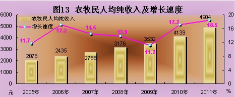 全区城镇居民人均可支配收入达16196元,比上年增长8.1%;农牧民人均纯收入4904元,增长18.5%。通过推进新农村建设、实施安居工程,年末已有33.87万户、174.27万农牧民住上了宽敞明亮的新房。年末城镇居民人均居住面积36.61平方米,农牧民人均居住面积达到29.61平方米。