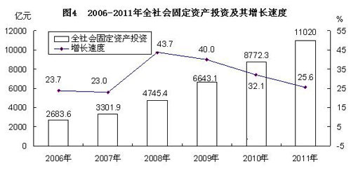 全年全社会固定资产投资11020亿元,比上年增长25.6%。固定资产投资8756.1亿元,增长27.7%。分产业看,在固定资产投资中,第一产业投资182.2亿元,增长5.5%;第二产业投资5210.0亿元,增长27.7%,其中工业投资5155.0亿元,增长27.3%;第三产业投资3363.9亿元,增长29.0%。分投资主体看,国有经济投资1995.5亿元,增长11.1%;非国有投资6760.6亿元,增长33.5%,其中民间投资6320.6亿元,增长35.8%。