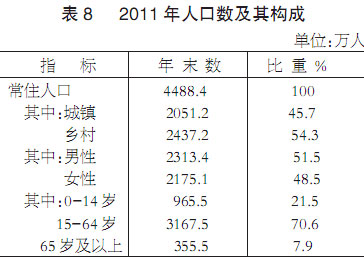 根据人口变动情况抽样调查统计,年末常住人口4488.4万人,比上年末增长0.6%。65岁及以上老年人口355.5万人,占总人口的比重为7.9%。全年出生人口60.3万人,出生率13.48‰;死亡人口26.76万人,死亡率5.98‰;自然增长率7.5‰。
