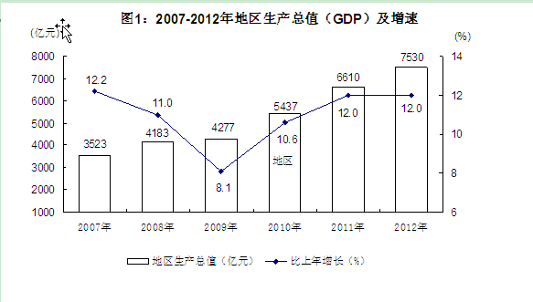 初步核算,全年实现地区生产总值(GDP)7530.32亿元,比上年增长12.0%。其中,第一产业增加值1320.57亿元,增长7.0%;第二产业增加值3560.75亿元,增长13.7%;第三产业增加值2649亿元,增长12.3%。