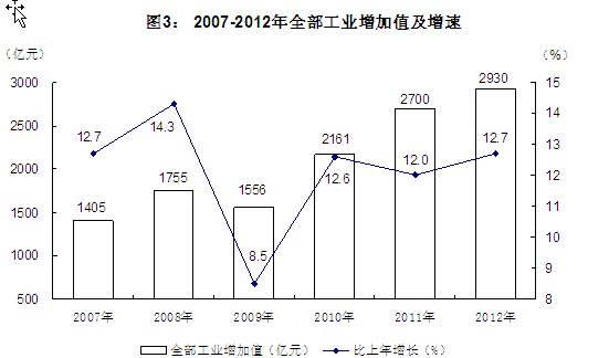 全部工业增加值2929.90亿元,比上年增长12.7%。规模以上工业增加值2804亿元,增长12.7%。其中,轻工业207.24亿元,增长14.0%,重工业2596.76亿元,增长12.5 %;石油工业1386.17亿元,增长4.1%,非石油工业1417.83亿元,增长21.8%;公有制经济2155.23亿元,增长10.7%,非公有制经济648.77亿元,增长21.0%;中央企业1903.47亿元,增长8.0%,地方工业900.53亿元,增长22.4%。