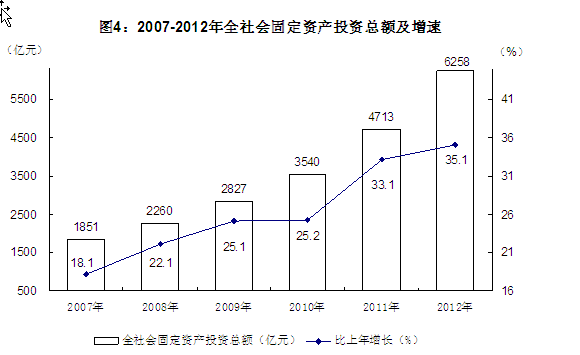 全社会固定资产投资6258.38亿元,比上年增长35.1%。其中,城镇投资5593.81亿元,增长35.0%;农村投资664.57亿元,增长36.3%。