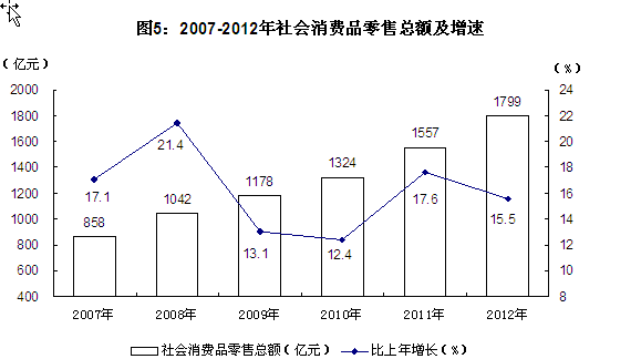 社会消费品零售总额1798.99亿元,比上年增长15.5%,扣除价格因素,实际增长11.8%。