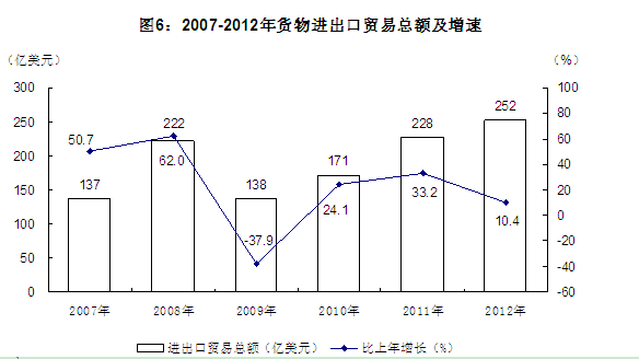 货物进出口总额251.71亿美元,比上年增长10.3%。其中,出口193.47亿美元,增长15.0%;进口58.24亿美元,下降2.8%。口岸进出口货运量4112万吨,增长18.6%。