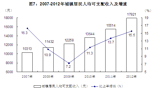 城镇居民人均可支配收入17921元,比上年增长15.5%。人均家庭总收入20195元,增长14.5%,其中,工资性收入14432元,增长14.1%;经营净收入1633元,增长15.6%;财产性收入146元,下降2.4%;转移性收入3984元,增长16.6%。人均消费性支出13892元,增长17.3%,其中,人均食品支出5239元,增长15.5%。