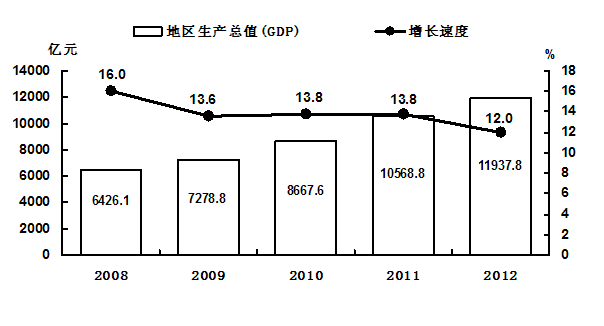 初步核算,全省实现地区生产总值[2]11937.82亿元,比上年增长12.0%。其中,第一产业实现增加值1412.11亿元,增长5.3%;第二产业实现增加值6374.45亿元,增长14.0%;第三产业实现增加值4151.26亿元,增长11.0%。按常住人口计算,当年全省人均GDP达到43412元,增长11.9%。三次产业的结构比例为11.8 : 53.4 : 34.8,对经济增长的贡献率分别为4.9%、62.9%和32.2%。