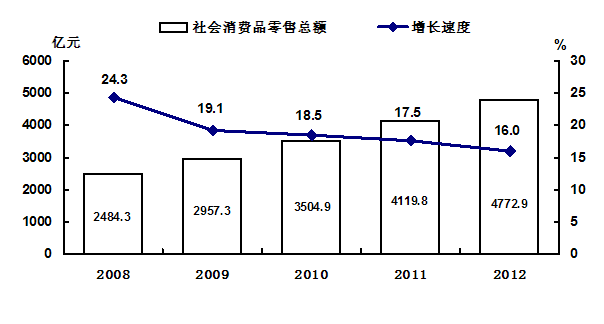图5:2008—2012年全省社会消费品零售总额及其增长速度