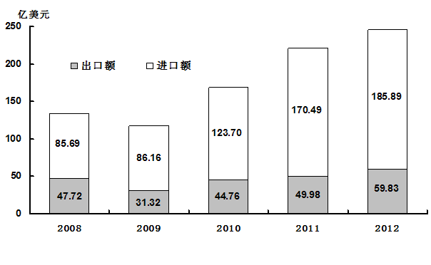 根据海关统计,全年累计实现外贸进出口总值245.72亿美元,增长11.4%。其中,实现出口总值59.83亿美元,增长19.7%;实现进口总值185.89亿美元,增长8.9%。