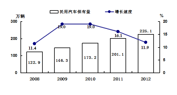 2012年末,全省民用汽车保有量225.1万辆,比上年末增长11.9%。全省私人汽车保有量185.3万辆,增长16.4%,其中私人轿车保有量98.6万辆,增长26.6%。