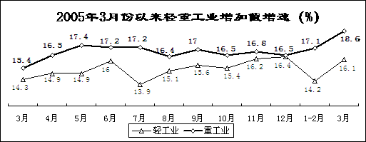 重工业增速加快。一季度,轻工业完成增加值5428亿元,同比增长14.7%,增速同比减缓1.3个百分点;重工业完成增加值12395亿元,增长17.6%,加快1.3个百分点。