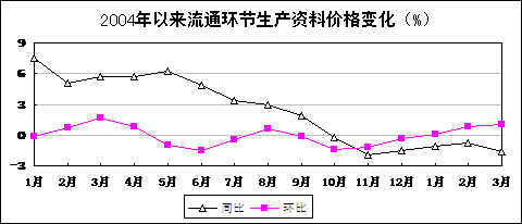 生产资料市场价格涨幅继续回落。3月份,工业品出厂价格同比上涨2.5%,涨幅同比回落3.3个百分点。原材料、燃料、动力购进价格上涨6.2%,回落3.5个百分点。流通环节生产资料价格下降1.6%,已连续6个月同比下降,但是环比保持连续3个月的上升态势。