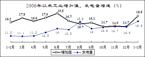 1-2月,全国发电量4480亿千瓦时,同比增长16.6%,增速同比加快5.4个百分点;其中,火电、水电分别增长18.2%和10.1%。电力供求紧张状况比去年同期继续缓和,但京津唐、湖北、四川、湖南、西藏、江苏、云南、广东、海南等9个电网仍存在拉闸限电现象。前两个月,电力行业实现利润215亿元,增长59.2%。
