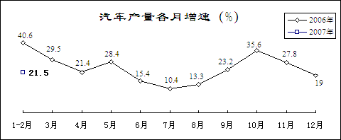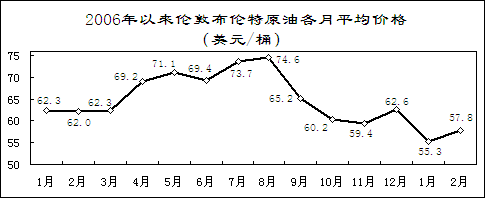 1-2月,全国原油产量3044万吨,同比增长2.5%;进口原油2579万吨(海关统计),增长5.7%;原油加工量5138万吨,增长5.7%,增速同比加快1.8个百分点;其中,汽油、柴油产量分别增长7.1%和4.1%。天然气产量116亿立方米,增长12.7%。主要化工产品中,烧碱、纯碱产量分别增长18.2%和8.8%,化肥、农药产量分别增长9.1%和31.4%。国际原油价格大幅波动。布伦特原油平均价格1月份为55.3美元/桶,比2006年12月份下降11.7%;2月份升至57.8美元/桶,比1月份上涨4.5%,同比下降4.2%。前两个月,石化行业实现利润817亿元,增长24.2%。其中,化工行业利润188亿元,增长86.7%。