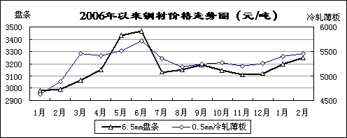 1-2月,全国粗钢产量7425万吨,同比增长23.1%,增速同比加快6.3个百分点;钢材产量7901万吨,增长25.4%,加快4.1个百分点,其中热轧薄板、镀层板(带)、冷轧薄板、冷轧薄宽钢带等高附加值产品增速超过50%。钢材出口875万吨,增长1.4倍;进口270万吨,下降4.6%。铁矿砂进口6459万吨,增长24.5%。钢材价格稳步回升,2月末国内市场钢材价格综合指数109.62点,比年初、1月末分别上升4.47点和1.58点,同比上升13.07点。6.5mm盘条、10mm中板、0.5mm冷轧薄板平均价分别为3253元/吨、4255元/吨和5466元/吨,同比上涨8.7%、31%和12%,比年初上涨4.3%、10.5%和3.8%。前两个月,全行业实现利润282亿元,同比增长2.76倍。