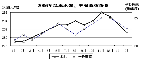 1-2月,全国水泥产量14871万吨,同比增长23.8%,增速同比加快2.5个百分点;平板玻璃产量7200万重量箱,增长10.2%,减缓11.3个百分点。水泥、平板玻璃价格呈下滑之势。重点建材企业水泥平均出厂价1月份为283元/吨,比2006年12月份下降2元/吨,2月份降至281元/吨,同比上升2元/吨;平板玻璃出厂价1月份为64元/重量箱,比2006年12月份下降1元/重量箱,2月份降至63元/重量箱,同比上升1元/重量箱。2月末,重点建材企业水泥库存1022万吨,同比上升10.6%;平板玻璃库存2273万重量箱,上升6.7%。前两个月,建材行业实现利润65.4亿元,增长1.22倍。其中,水泥和平板玻璃制造行业实现利润分别由去年同期净亏损0.35亿元和4.7亿元转为净盈利8.6亿元和1亿元。