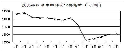 1-2月,纺织行业增加值同比增长17.9%,增幅同比提高1.2个百分点;出口交货值927亿元,增长16.5%,提高0.4个百分点。纱产量260万吨,布产量64.3亿米,分别增长20.1%和11.3%。服装产量26.6亿件,增长18%。化纤产量347万吨,增长16%。国内棉花价格有所上升。2月末,国内棉花价格指数为13032元/吨,比1月末和2006年末分别上涨39元/吨和179元/吨,与国际棉价基本持平。前两个月,纺织行业实现利润112亿元,增长38.7%。其中,化纤行业、纺织业、服装行业实现利润分别增长2.2倍、33.4%和24.4%。