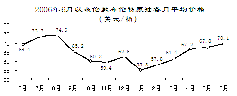 全国原油产量9331万吨,同比增长1.7%;进口原油8154万吨(海关统计),增长11.2%;原油加工量16070万吨,增长7%,增速同比加快1.4个百分点,其中汽油、柴油产量分别增长8%和6.2%。天然气产量331亿立方米,增长17.2%。主要化工产品中,乙烯产量增长18.7%,烧碱、纯碱产量分别增长17.3%和10.7%,化肥、农药产量分别增长12.3%和25.6%。国际原油价格持续上涨。布伦特原油平均价格6月份为70.1美元/桶,比上月提高2.3美元/桶,涨幅为3.5%;同比上涨0.7美元/桶,涨幅为1%。前五个月,石化行业实现利润2242亿元,增长27.1%;其中,化工行业利润620亿元,增长75.7%。