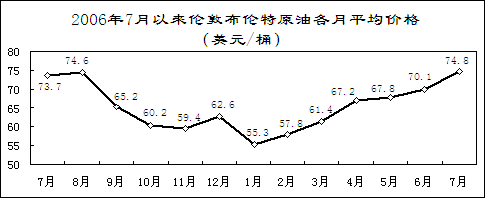 当月全国原油产量同比下降1.7%;原油加工量增长6.7%,增速比上月减缓3.1个百分点,其中汽油、柴油产量分别增长13%和6.5%。天然气产量增长19.8%,比上月减缓1.9个百分点。国际原油价格快速上涨。当月布伦特原油平均价格74.8美元/桶,比上月提高4.7美元/桶,同比提高1.1美元/桶,涨幅分别为6.7%和1.5%。1-7月,全国原油产量10869万吨,增长1.1%;进口原油9637万吨(海关统计),增长14.8%;原油加工量18826万吨,增长7%,其中汽油、柴油产量分别增长8.7%和6.2%。天然气产量386亿立方米,增长17.1%。主要化工产品中,乙烯产量增长15.8%,烧碱、纯碱产量分别增长16.4%和8.6%,化肥、农药产量分别增长11.8%和21.6%。