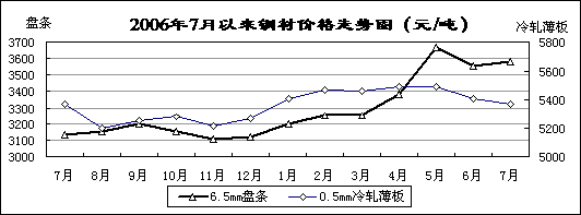 当月全国粗钢产量同比增长14.5%,增速比上月减缓0.1个百分点;钢材产量增长23.9%,加快2.1个百分点。钢材出口594万吨,比上月减少42万吨;进口139万吨,比上月减少2万吨。钢材价格略有回落。月末,国内市场钢材价格综合指数为110.31点,比上月末回落0.4点,同比提高2.92点。建筑用钢材价格呈上升之势,板材价格有所回落。6.5mm盘条、16mm钢筋价格比上月末分别上涨0.7%和2.5%,同比上涨14.4%和18%;0.5mm热轧薄板价格比上月末下降1.4%,同比下降3.6%;0.5mm冷轧薄板价格比上月下降0.6%,与去年同期基本持平。1-7月,全国粗钢产量27891万吨,增长18.5%;钢材产量31869万吨,增长24.3%。铁矿砂进口22150万吨,增长19%。钢材出口3970万吨,增长92.2%;进口1009万吨,下降7.8%。