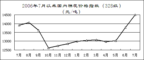 当月纺织行业增加值同比增长15.5%,增速比上月减缓1.9个百分点;出口交货值增长13%,比上月减缓4.2个百分点。纱、布产量分别增长16%和15.5%,化纤产量增长19.2%,服装产量增长12.5%。国内棉花价格有所上涨。7月末,国内棉花价格指数(328级)为14500元/吨,比上月末提高719元/吨,涨幅为5.2%。1-7月,纺织行业增加值同比增长16.9%,同比加快0.4个百分点;出口交货值4042亿元,增长15.8%,加快0.9个百分点。纱产量1100万吨,布产量279亿米,分别增长20.2%和13.9%。化纤产量1355万吨,增长18%。服装产量108亿件,增长14.1%。